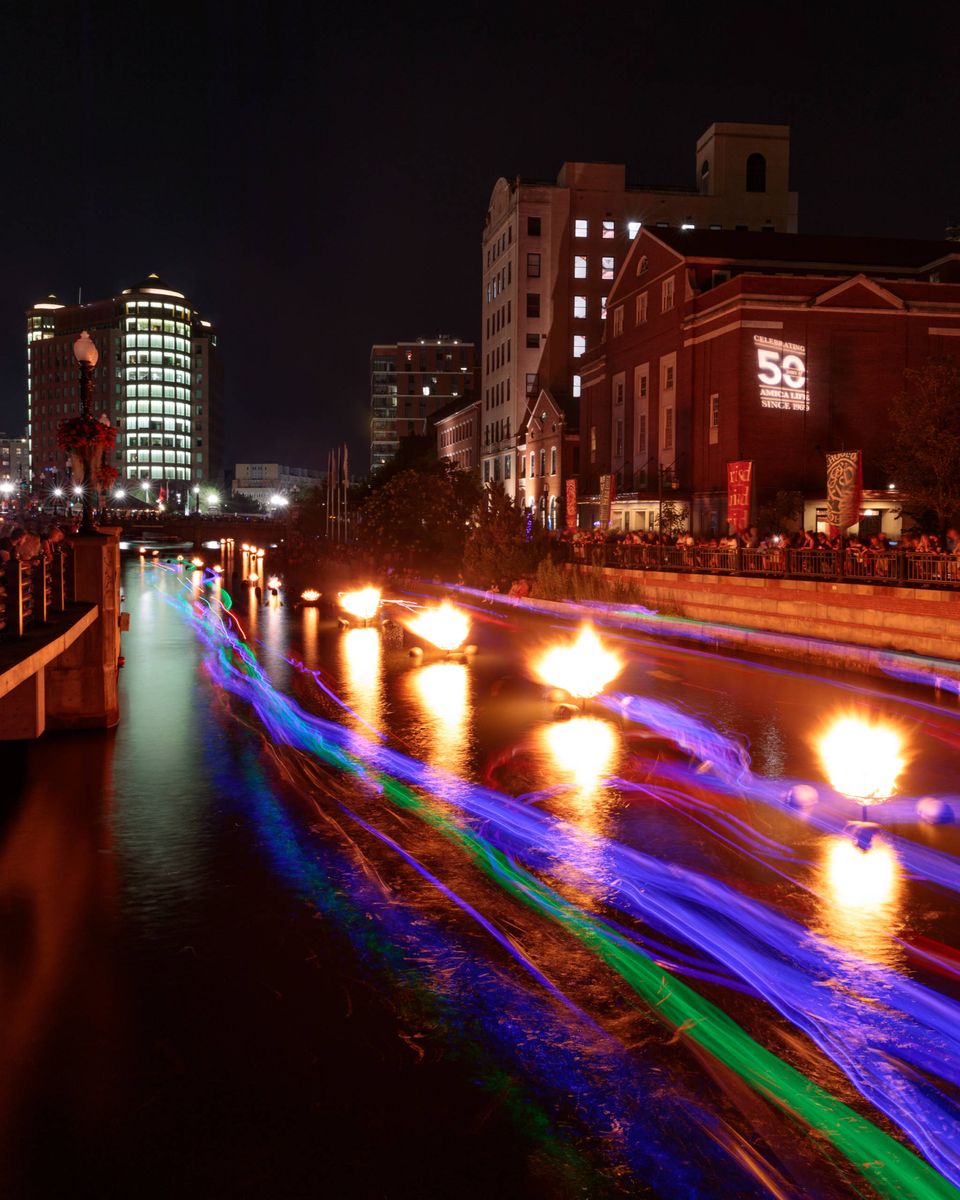As an artist living in the Providence area, WaterFire has long been one of my favorite subjects. Once a year, WaterFire hosts their "Clear Currents" event, where people paddle kayaks mounted with illuminated neon koi fish in "schools" up and down the rivers between the fires. This year I decided to shoot some long exposures of the koi schools in an attempt to capture light trails on the water. I ended up stacking three 20 second exposures in photoshop for the final image, allowing me to capture 60 seconds of light trails without over-exposing the buildings around the river.
