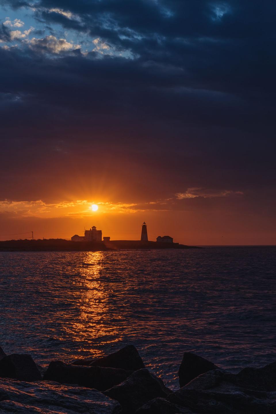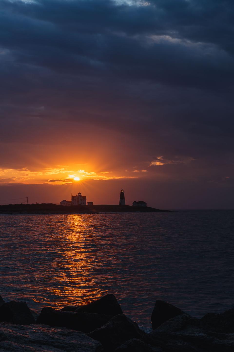 I arrived at Point Judith a few minutes before the 6:33 a.m. sunrise to mostly clouds. As I started to set up my gear and the sky continued to brighten, rays of sunlight began to appear through a few gaps in the clouds. But would the sun actually line up?